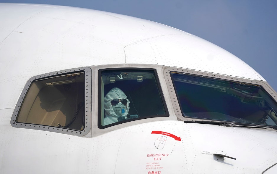 A pilot wearing a protective suit parks a cargo plane at Wuhan Tianhe International Airport in Wuhan, China, Jan. 28, 2020. Cheng Min/Xinhua via AP