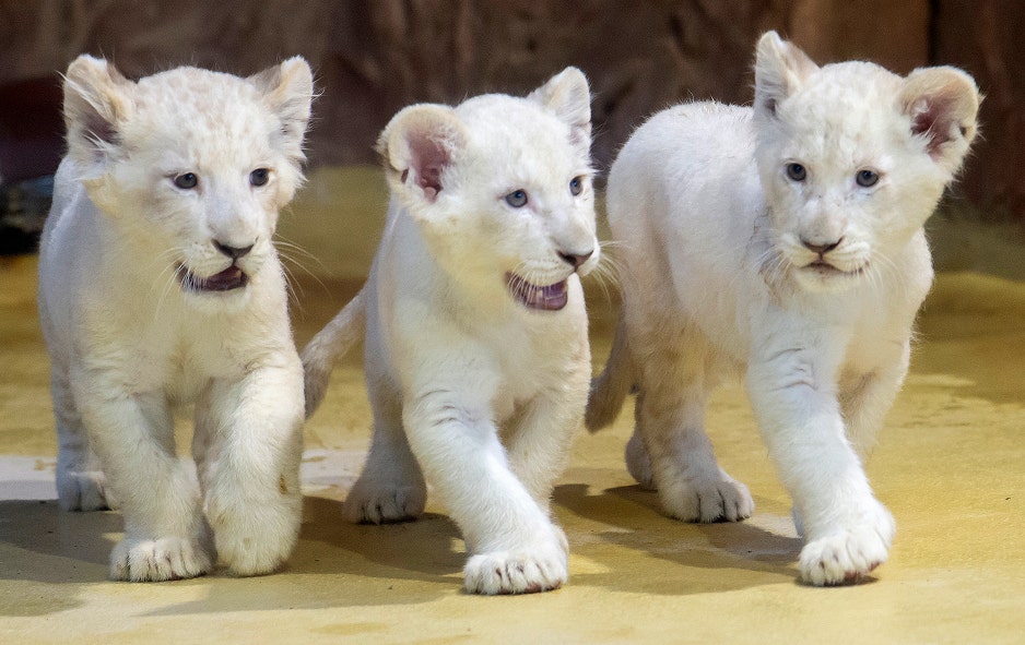 Three rare white lion cubs born in November, one male and two females explore their enclosure at the zoo in Magdeburg, Germany,