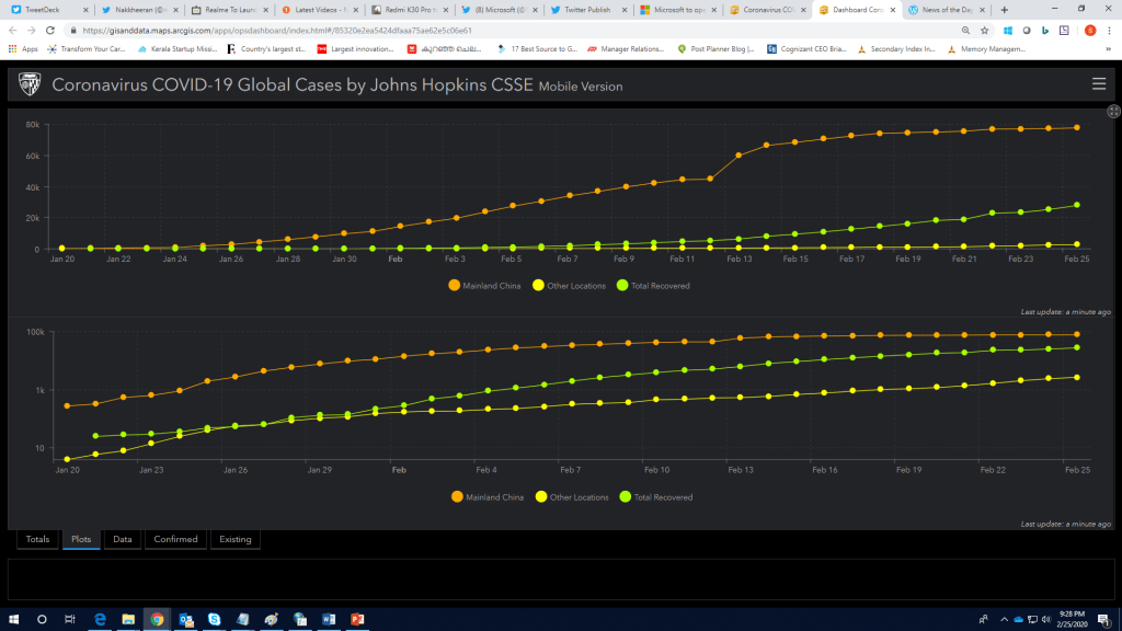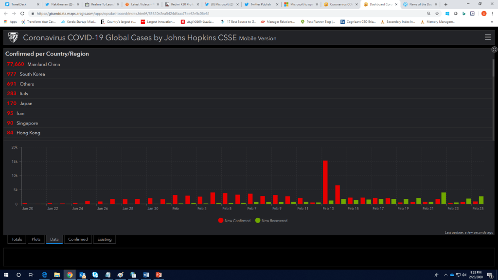 February 25, 2020 Artist Aditya #Coronavirus #COVID19 Update – 25-2-2020 https://gisanddata.maps.arcgis.com/apps/opsdashboard/index.html#/bda7594740fd40299423467b48e9ecf6 Total Confirmed : 80,347 Total Recovered : 27,878 Total Deaths : 2,705 #COVID Status 2020 Statistics Share this: Click to share on X (Opens in new window) X Click to share on Facebook (Opens in new window) Facebook Like Loading... Related